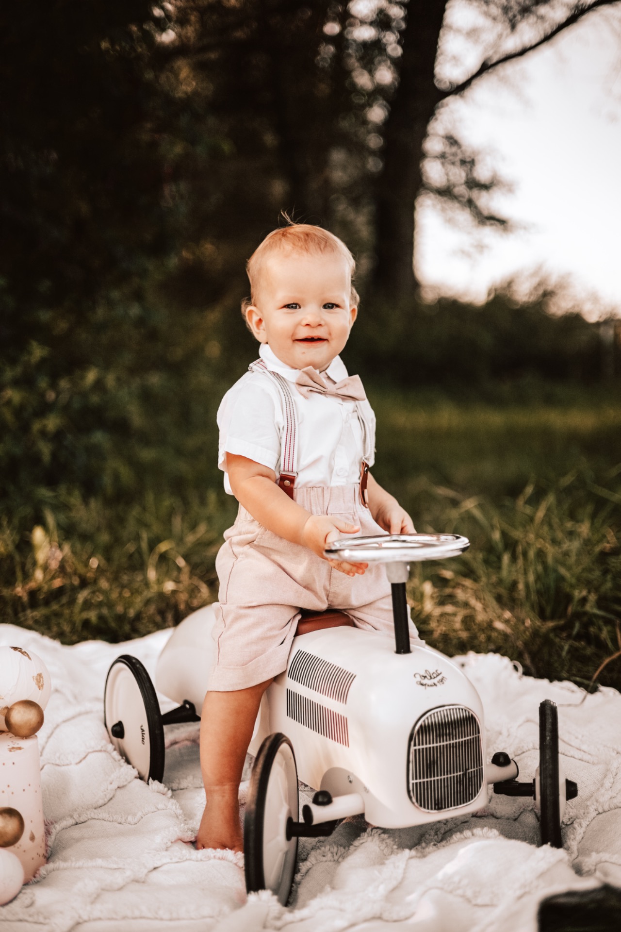 Rekvizity: retro odrážedlo, dort, baldachýn, deka, piknikový koš, proutěný koš s kvítím umělým i sušeným.