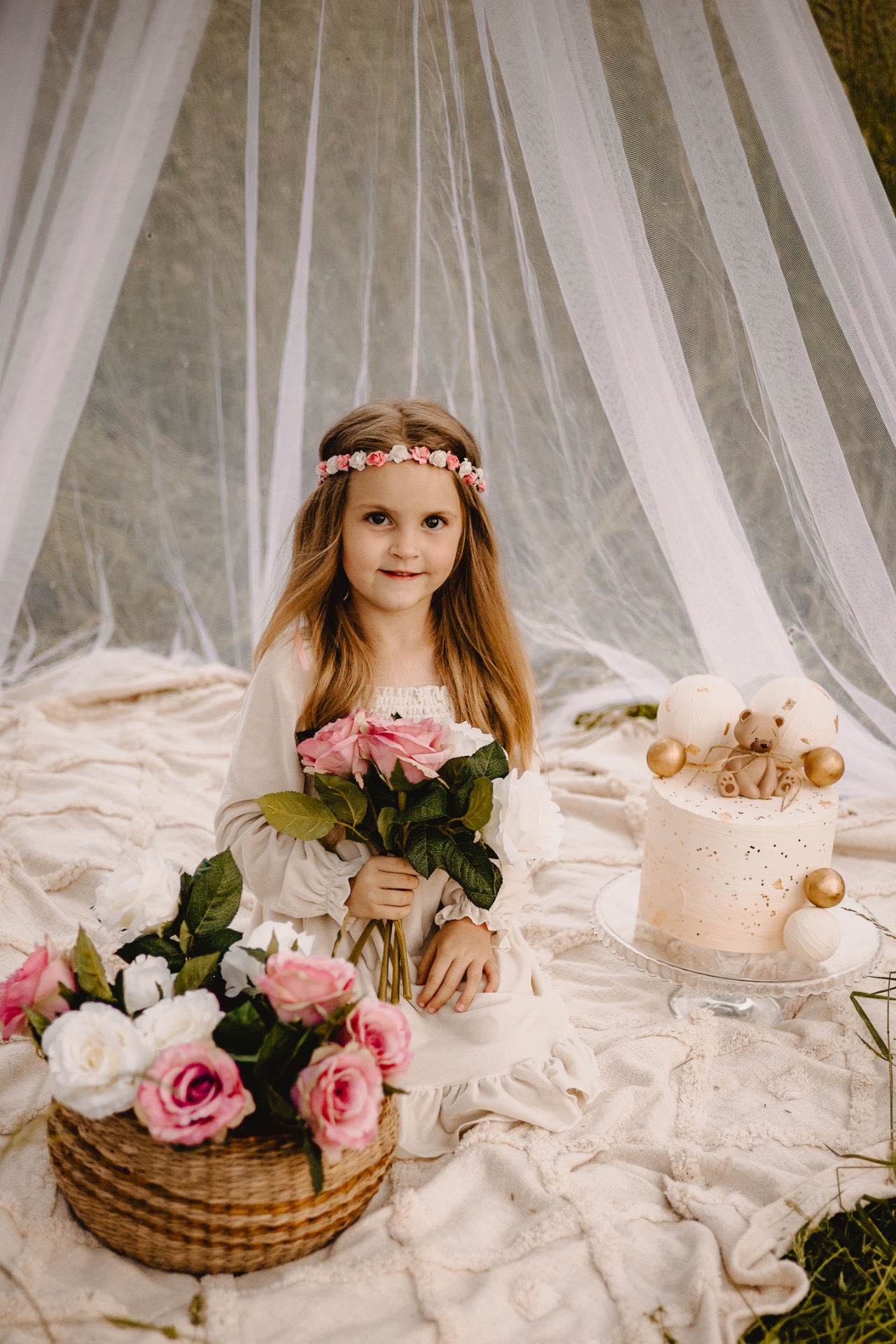 Pojměte narozeninové focení jako odpolední piknik plný zábavy a radosti. Mám vše potřebné - deku, síťový baldachýn a piknikový koš. Děti můžou popíjet dětské šampaňské, nebo džus k tomu zobat ovoce, jako třeba jahody, meloun, jablíčka, borůvky nebo maliny.